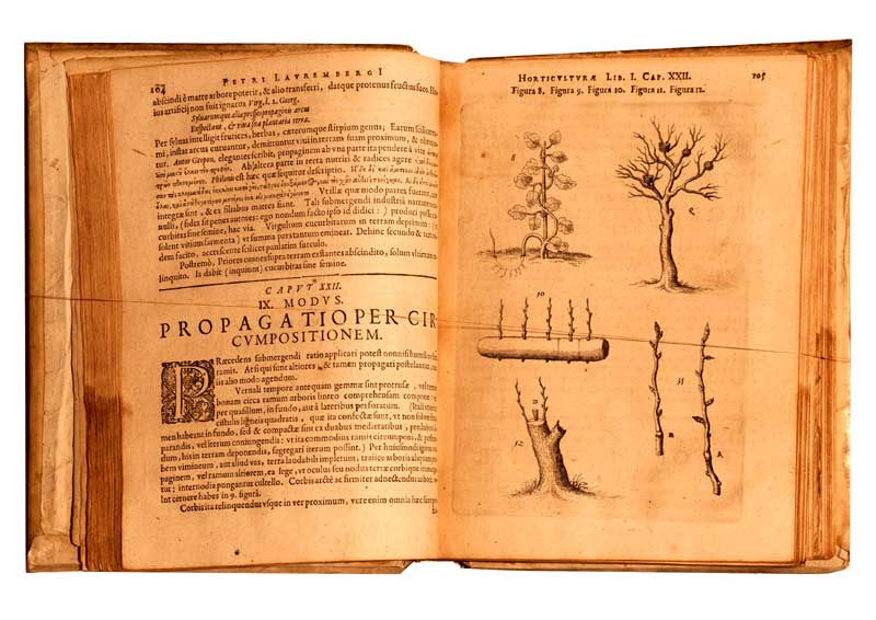First edition of one of the best of the early 17th-century gardening manuals, scientific in its detail and approach. It is known to have influenced John Evelyn who quotes it in his unpublished 'Elysium Britannicum'. Morton describes the work as 'typical of the experience and ideas that began to flow into botany from horticulture' and goes on to recount how Lauremberg rejected the idea of the 'plant soul' having a specific location, because 'horticulturalists knew that plants could live and reproduce themselves from very small pieces cut from the roots (i.e. rhizomes, stolons, etc.) as well as from branches, stems, seeds, and even leaves (as in the case of the Indian fig). Therefore the soul or vital force (vigor vitalis) is not in one part more than another, but diffused through the whole plant body... Lauremberg describes his own experiment, lasting three years, in which two hundred vine cuttings were grown in close association with two varieties of cabbage in order to test an ancient belief, mentioned by Pliny, that vine and cabbage adversely affect each other. He found, however, that both species flourished and there was no evidence of mutual inhibition... In other experiments he found, contrary to tradition, that rue and fig did not benefit from interplanting. There were many gardener's notions about how seeds were best oriented when sown; the wrong way was said to give dwarf or unthrifty plants. Again, Lauremberg made his own observations with seeds of pea, cucurbita, walnut, almond, date and others, finding that the stem grew upwards and the root downwards irrespective of the original orientation, and that the alleged effects of malplacement were "empty superstition"' (Morton, History of botanical science p. 222-3). The work covers a variety of topics, including the layout of the orchard and flower and herb gardens, topiary, labyrinths, sundials, etc. Five plates illustrate gardening tools, 18 are of designs for parterres and labyrinths, and two are for topiary. The second title, 'Apparatus plantarum', the sequel to the 'Horticultura', is devoted to bulbous and tuberous plants, including the most popular garden flowers of the time. It 'deals not only with their medicinal and culinary uses, but their care and propagation, places in literature, etc.' (Johnston). Hunt 22; Nissen BBI 1146; Pritzel 50888.