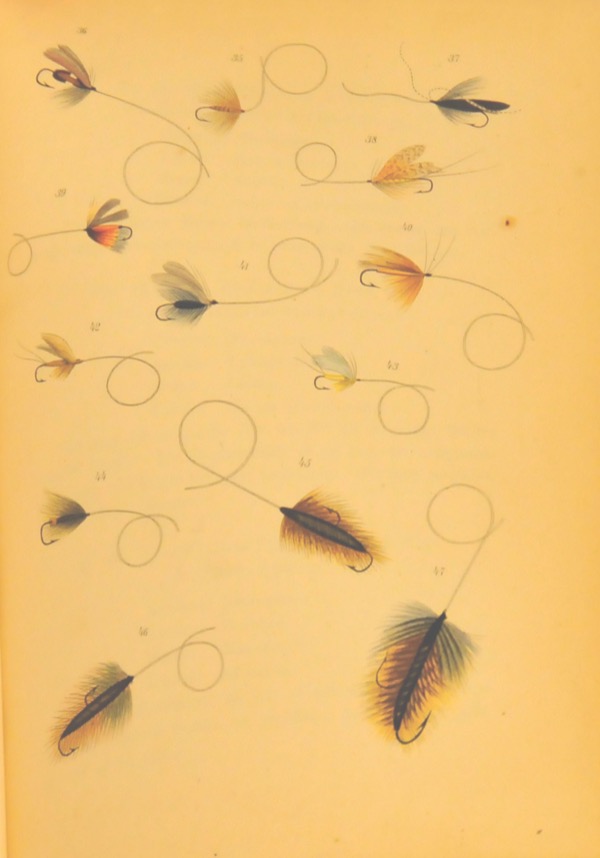 Die Kunst der Fliegenfischerei auf Forellen und Aschen in Deutschland und Oesterreich. Mit einem Titelkupfer und 4 Tafeln mit Abbildungen der ausgesuchtesten künstlichen Fliegen. (Seltene originale Erstausgabe dieses Fischereibuches mit fein koloriertem Titelfrontispiz, 4 kolorierten Tafelkupfern und 5 Seitenlithographien/ Originaler Ledereinband goldgraviert mit floralen Prägungen auf Deckel und Titelrücken) (Very rare original first edition of this book about fly fishing with brightly hand-colored title frontispiece, 4 hand-colored engraved plates and 5 lithographs on pages/ original full calf binding florally engraved in gold on covers and spine) (Très rare première édition originale de cette œuvre sur la pêche à la mouche avec un titre frontispice brillantement coloré à la main, 4 tableaux gravés et colorés à la main et 5 lithographies sur pages/ reliure originale en cuir gravé de fleurs et en or sur les couvertures et le dos)
